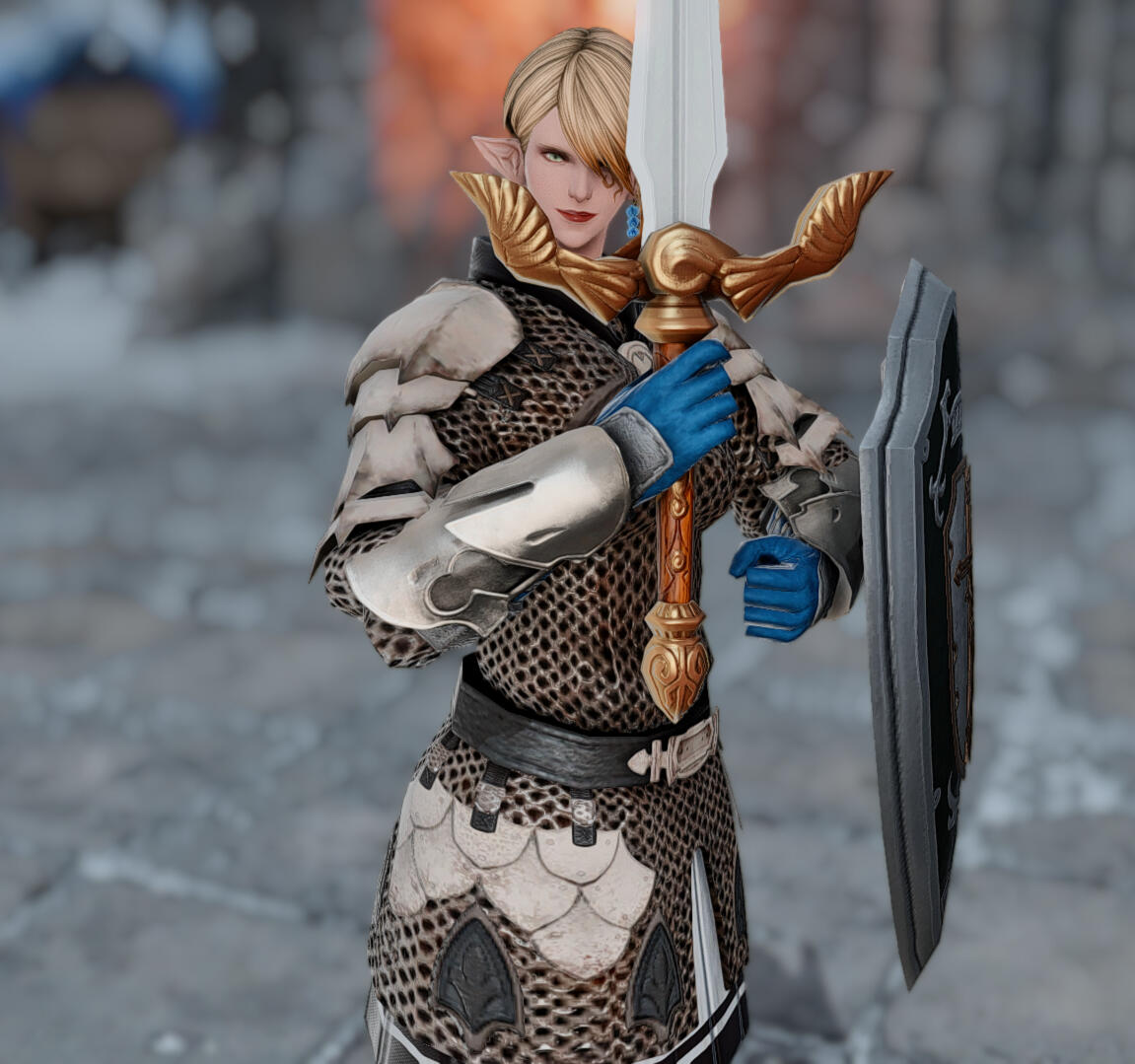 Astrelle was born a bastard scion of a noble house. She is not sure herself which house she belongs to; she was abandoned in the Brume at a young age.Astrelle largely does not recall her younger years; she knows that she drifted from one place to the next, but she was only ever another mouth to feed, never a lasting member of a family. She carries a lot of resentment about Ishgard’s treatment of the people of the Brume into adulthood.As soon as she was old enough, Astrelle offered herself as a squire for any knight who would take her. She ended up squired to the heir of House Vairemont, a lesser house known mostly for its wineries. The knight was known for his great love of his family’s wines, and only occasionally left Ishgard proper to make wine deliveries in Coerthas. In one instance, when the knight was deep in his cups, Astrelle was forced to take up his sword to defend him against a biast, suffering grave injuries.House Vairemont, in recognition of her deed, supported her subsequent plea to join the Temple Knights. As a Temple Knight, Astrelle soon found she had a knack for swordplay. Her fight against the biast had been won through luck, but she quickly made up for it with skill... which she had little opportunity to display, as the Temple Knights largely had her on guard duty and similar tasks. Unlike some of her fellow knights, she never relented on her training and would often be found striking a training dummy in her scant free hours.House Vairemont also offered her the opportunity to join their house by marriage following her knighthood, and while Astrelle had no love lost on the nobility, she had little choice but to accept. Her husband, Vallerin, was distant at best, and she was no warmer to him. It was perhaps for the best when he was caught in the sudden snows of the Calamity and perished. Though she did not particularly grieve her husband, his passing brought her much closer to his parents and the rest of his family, and she remains welcome in their household. In recent years House Vairemont’s favor has fallen significantly, as Coerthas’s changed climate is no longer conducive to their primary means of labor.At the close of the Dragonsong War, Astrelle was tasked with defending Ishgard from the descending horde. Her long hours of training paid off, and she was able to deftly defend herself from the attacking dragons while allowing the smallfolk to get to safety.Now that the war is over, Astrelle continues to work as a Temple Knight to keep Ishgard safe. She’s started studying magic, hoping to use it to help defend the innocent. In what little free time she has, she helps out at the orphanage in the Firmament.